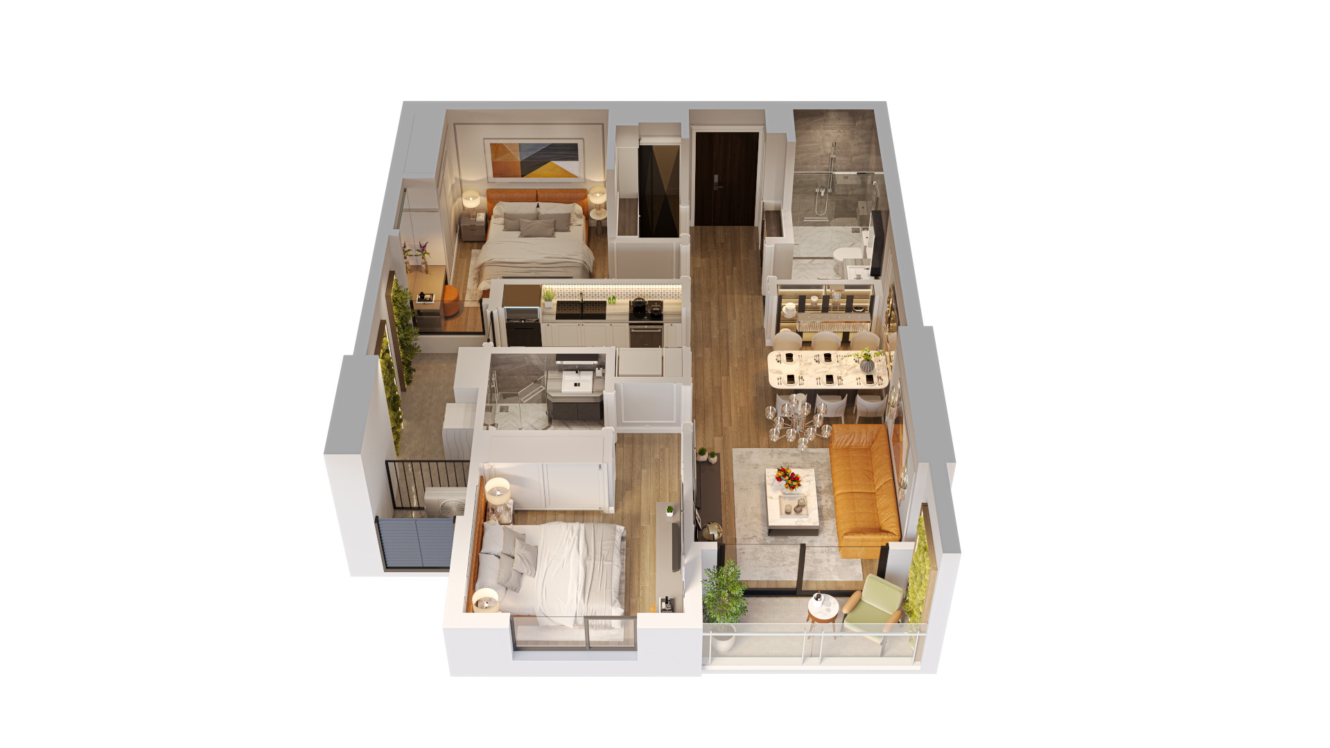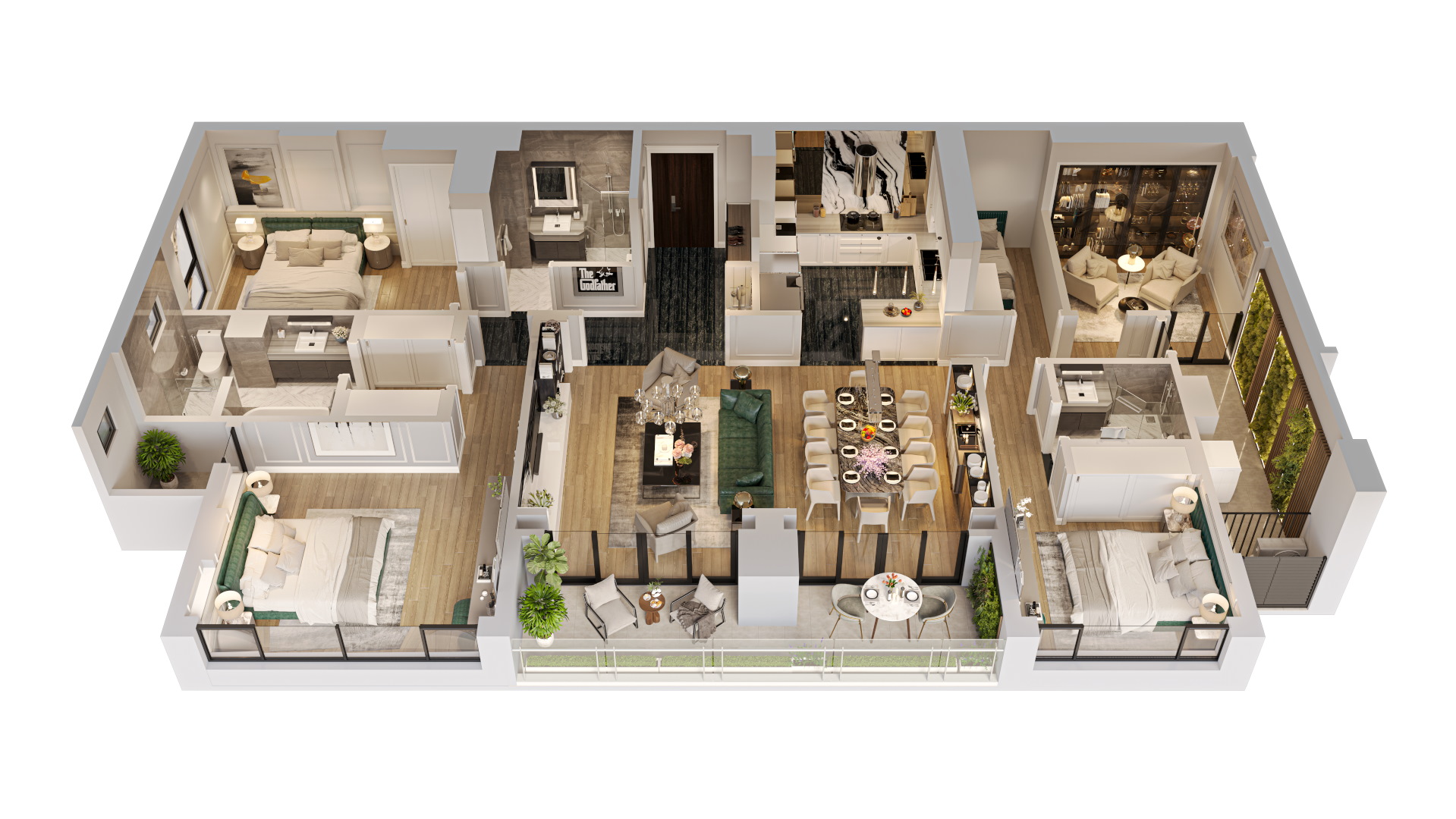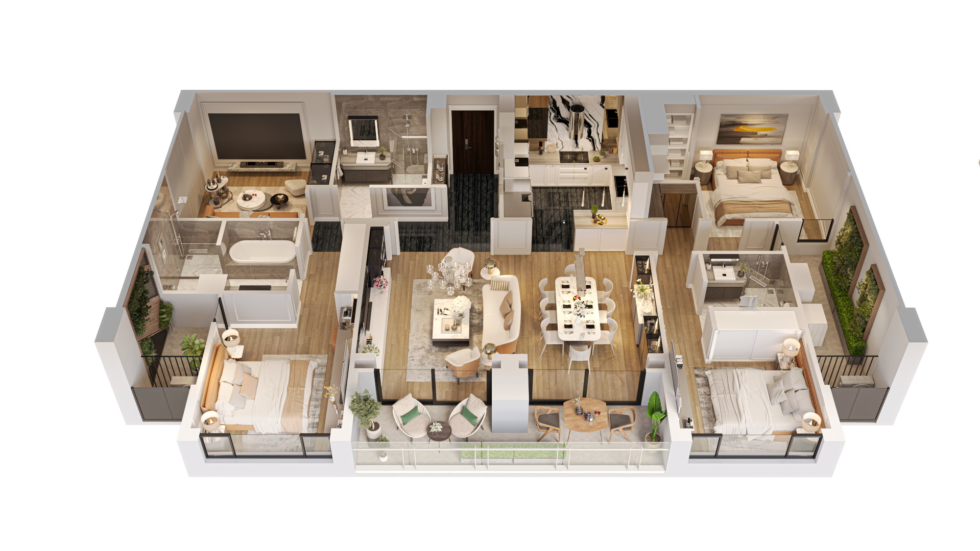 Những khu vườn độc đáo: các khu vườn dưới đất và vườn mái rợp bóng cây xanh. Vườn mái còn được kết hợp với khu BBQ rooftop – không gian lý tưởng cho những buổi sum họp gia đình, bạn bè.