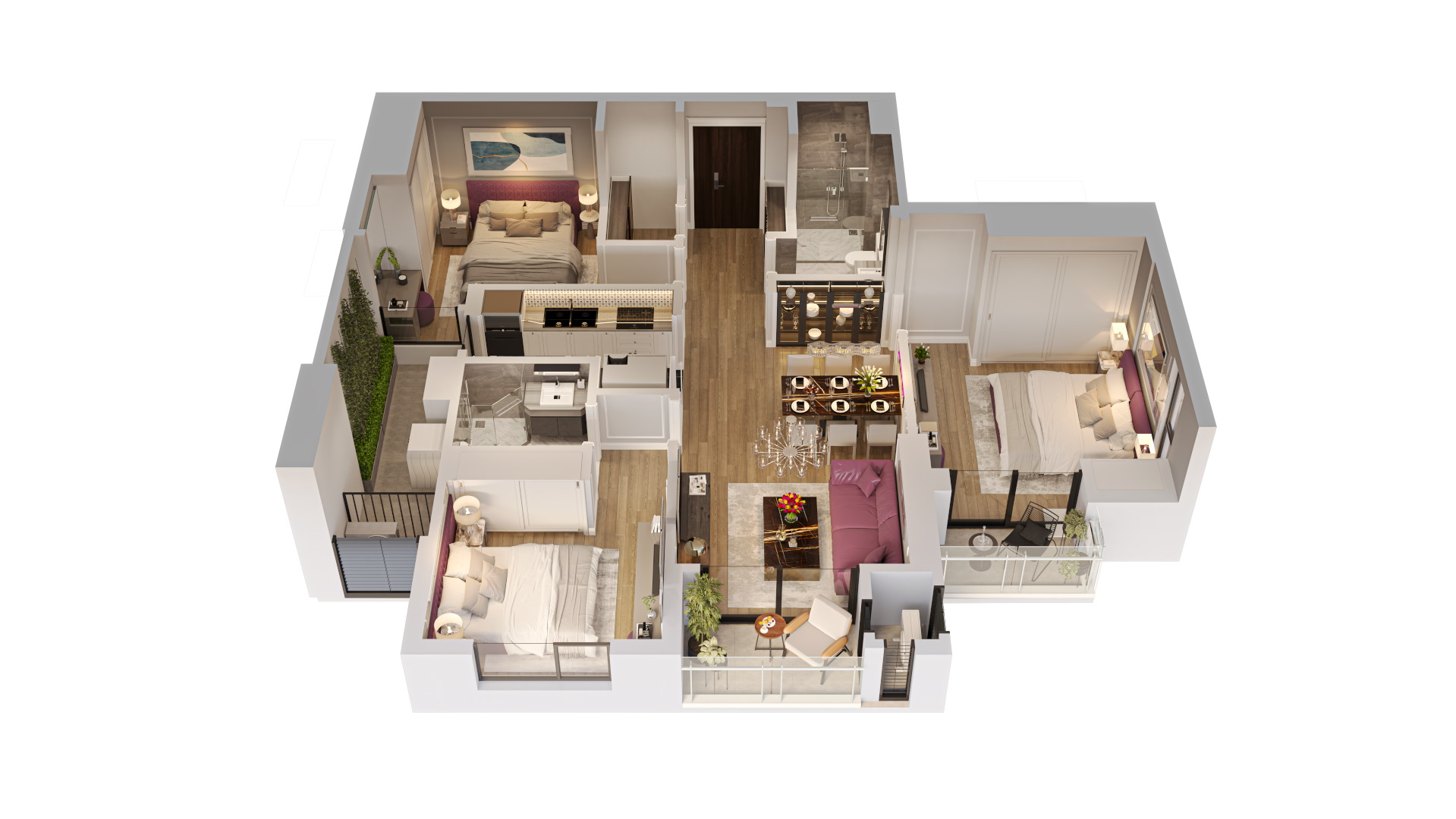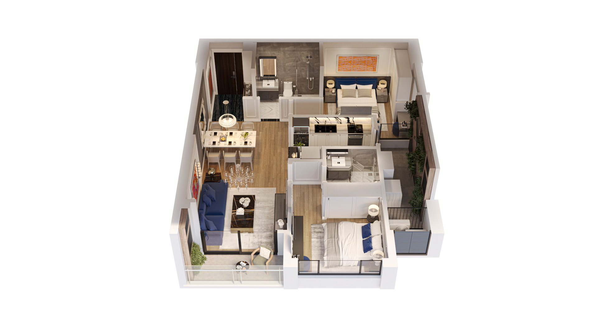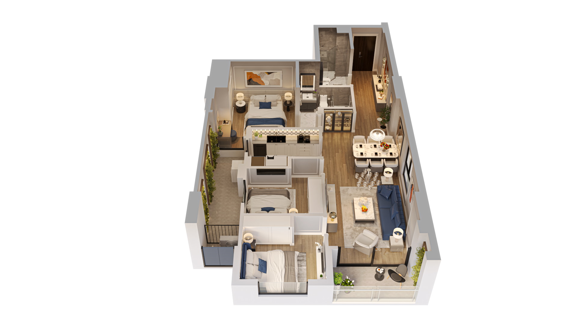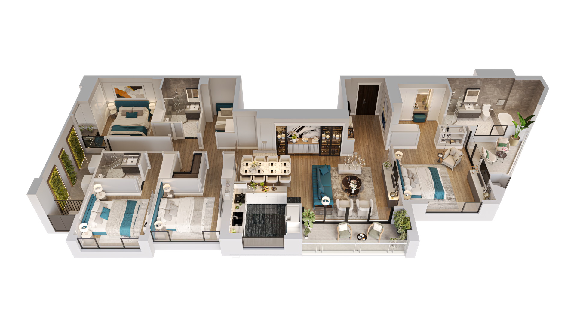 Những khu vườn độc đáo: các khu vườn dưới đất và vườn mái rợp bóng cây xanh. Vườn mái còn được kết hợp với khu BBQ rooftop – không gian lý tưởng cho những buổi sum họp gia đình, bạn bè.